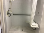 This Single Queen Bedroom is Wheelchair Accessible and is located on the Ground Floor. The room has on Onsite designated parking spot with 8 feet wide parking space. The distance from the Parking Spot to the room is approximately 175 ft. with minimum 36 inch wide openings along the outdoor corridor to the room.Inside the Single Queen Bedroom there is a ADA Complaint Roll-in shower and Toilet. The Drain and Water pipes are insulated and there are grab bars by the toilet and in the shower. The shower has a fold chair and the hand held shower can be height adjusted.